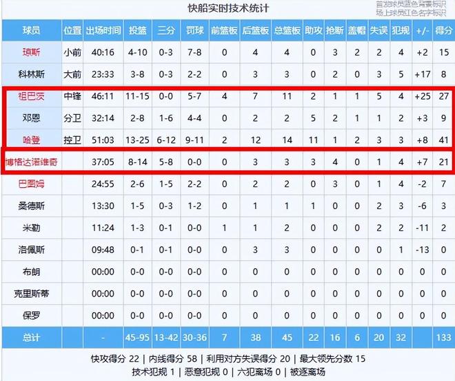 快船:哈登41分14板11助2帽、祖巴茨27分11板2助、博格达诺维奇21分3板3助4断、琼斯15分4板3断2帽、邓恩9分2板5助2断、科林斯8分3板2断、巴图姆7分2板3断、桑德斯3分1板1助、米勒2分2板、洛佩斯3板