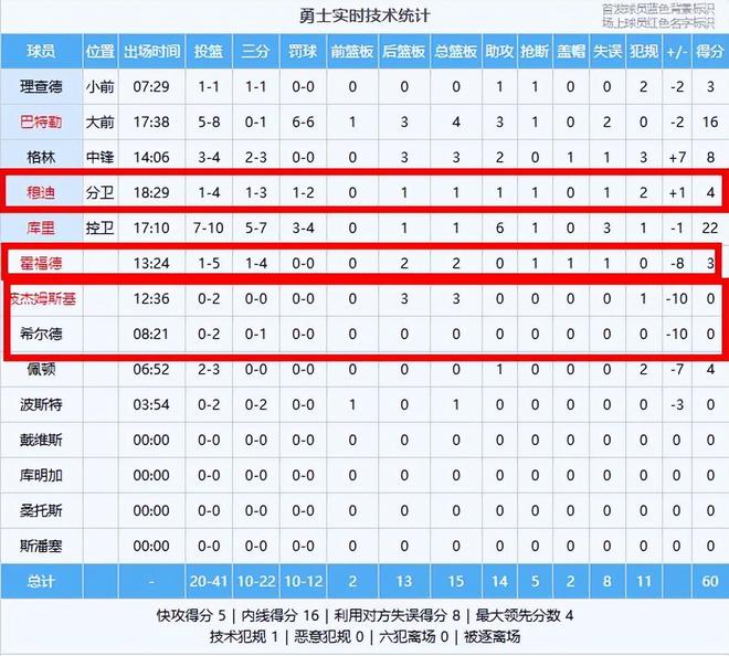 勇士(客队):库里22分1板6助、巴特勒16分4板3助、格林8分3板2助、穆迪4分1板1助、佩顿4分1助、霍福德3分2板、理查德3分1助、波杰姆斯基3板、波斯特1板
