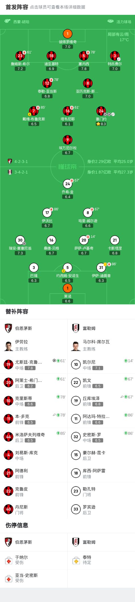 第78分钟,塞门约小角度穿门将小门扳平比分,伯恩茅斯1-1富勒姆